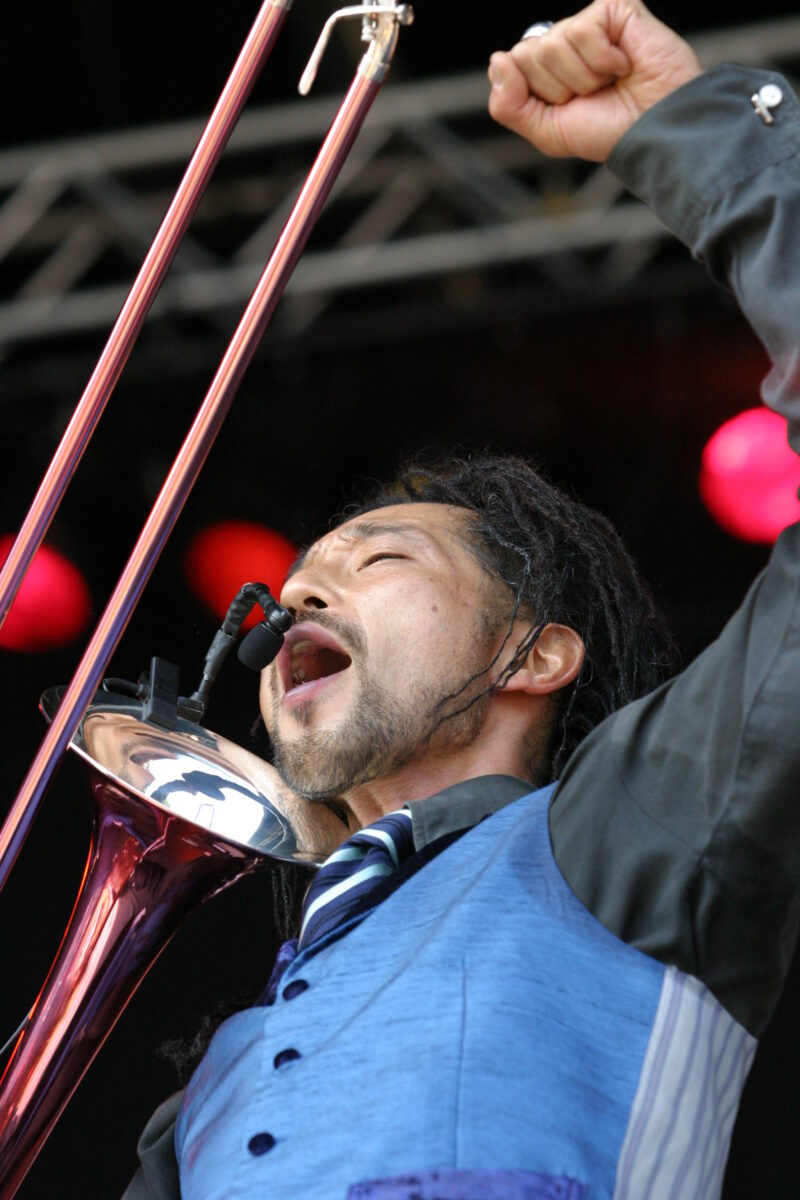 Tokyo Ska Paradise Orchestra: mannen in een blauw colbert die een swingbare mix van ska, punk en blues spelen